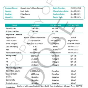 - Optimal extraction of mushroom Beta-Glucan ≥ 40%, Polysaccharides ≥ 45% @ 7:1 Ratio Concentrate